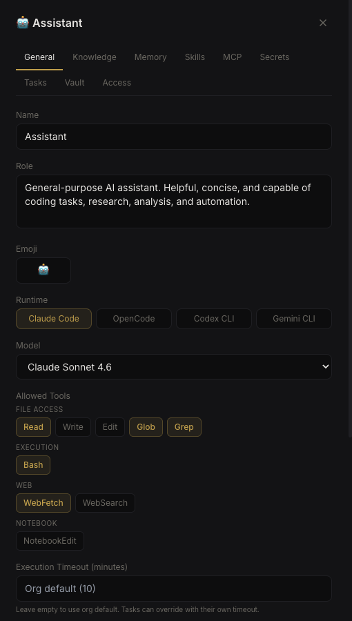 Each agent’s identity — role, runtime, model, allowed tools — is configured in the UI and persisted to SQLite.