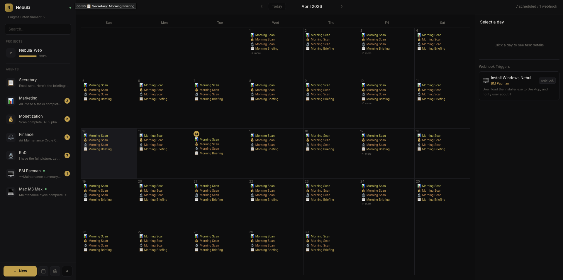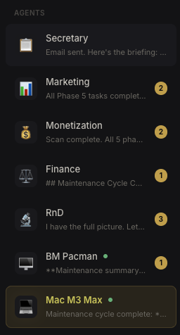 The first five are “thinking” agents — they research, analyze, and produce reports. The last two are “doing” agents — physical machines that run builds via Nebula’s remote agent feature (WebSocket bridge to a Tauri desktop app).
