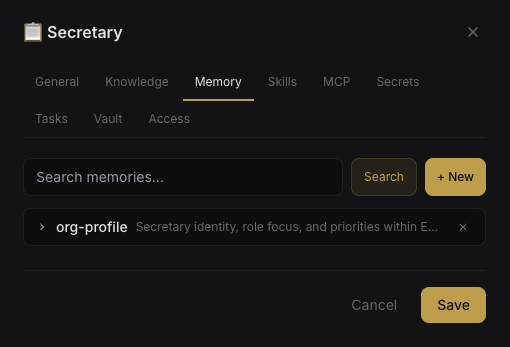 | Secretary | Chief of Staff | Aggregates morning/evening briefings from all agents, compiles dev activity from Gitea/TeamCity, manages email, coordinates across agents, writes weekly summaries |