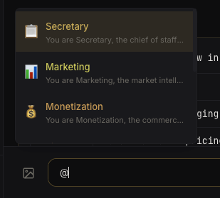 Throughout the day — I interact with agents as needed. If I want Marketing’s take on a competitor launch, I talk to Secretary and it pulls Marketing into the conversation with @Marketing. The platform handles context composition — Marketing receives the last N messages of relevant context, processes the request, and the response flows back through Secretary.