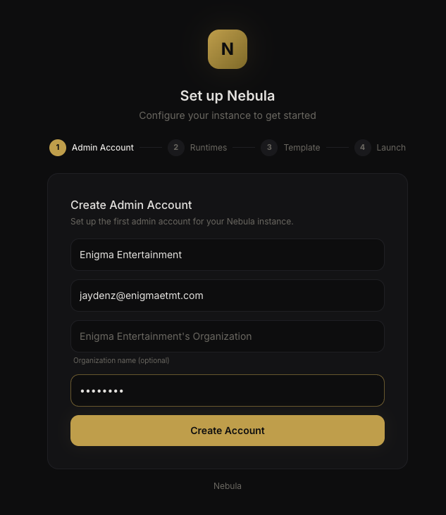 The setup wizard guides you through account creation, runtime detection, and first agent setup.
